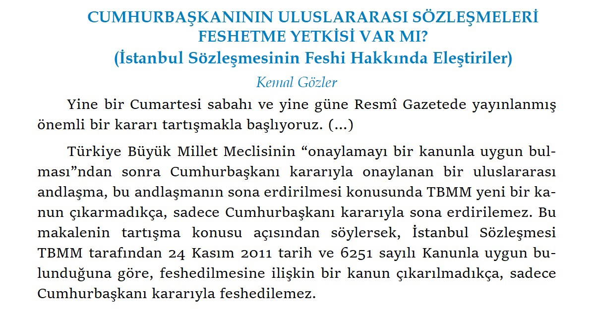 Kemal Gözler açıklamasında, "TBMM'nin 'oylamayı bir kanunla uygun bulması'ndan sonra Cumhurbaşkanı kararıyla onaylanan bir uluslararası andlaşma, bu andlaşmanın sonra erdirilmesi konusunda TBMM yeni bir kanun çıkarmadıkça, sadece Cumhurbaşkanı kararıyla sona erdirilemez. Bu makalenin tartışma konusu açısından söylersek,İstanbul Sözleşmesi, TBMM tarafından 24 Kasım 2011 tarih ve 6251 sayılı kanunla uygun bulunduğuna göre feshedilmesine ilişkin bir kanun çıkarılmadıkça sadece Cumhurbaşkanı kararıyla feshedilemez" ifadelerini kullandı.