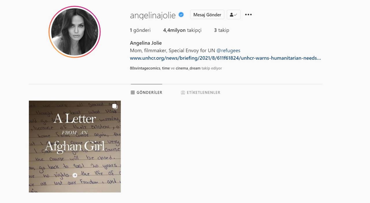 Aynı zamanda Birleşmiş Milletler Mülteciler Yüksek Komiserliği’nin (UNHCR) iyi niyet elçisi olan Jolie, bir Afgan kızın yazdığı mektubu paylaştığı ilk gönderisinde, 11 Eylül’den iki hafta önce Afganistan’da Taliban’dan kaçan Afgan mültecilerle görüştüğünü yazdı.