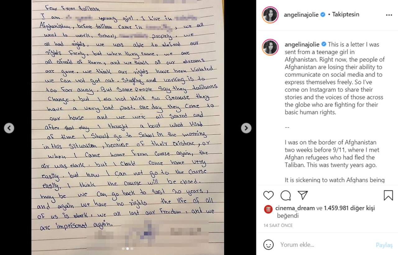 Ünlü oyuncunun, bir Afgan kızın kendisine yazdığı mektubu paylaştığı ilk gönderisi şu şekilde: