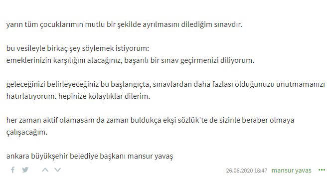"Mansur Yavaş" kullanıcı adıyla sözlüğe katılan Yavaş, ilk paylaşımını YKS’ye giren öğrenciler için yaptı. Yavaş paylaşımında şu ifadeleri kullandı: