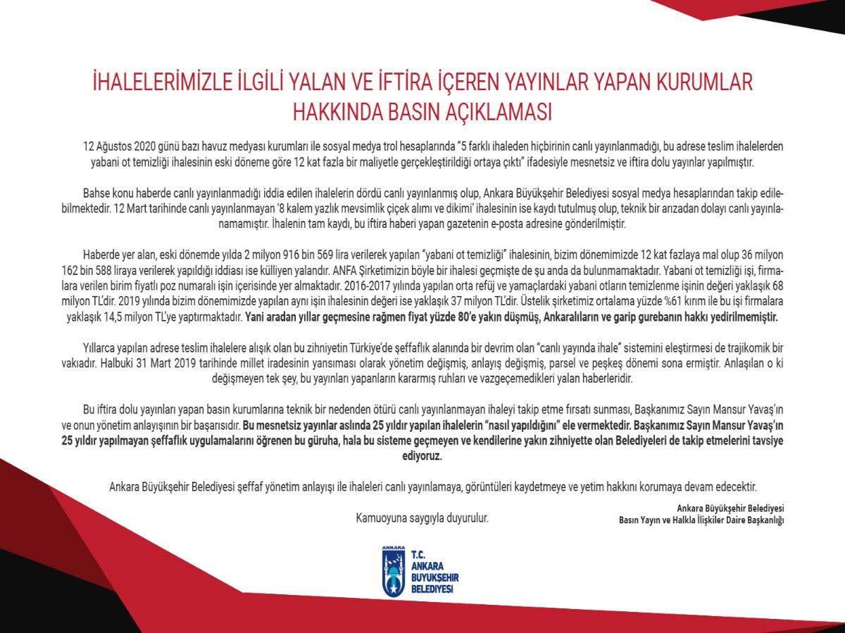 Bahse konu haberde canlı yayınlanmadığı iddia edilen ihalelerin dördü canlı yayınlanmış olup, Ankara Büyükşehir Belediyesi sosyal medya hesaplarından takip edilebilmektedir. 12 Mart tarihinde canlı yayınlanmayan ‘8 kalem yazlık mevsimlik çiçek alımı ve dikimi’ ihalesinin ise kaydı tutulmuş olup, teknik bir arızadan dolayı canlı yayınlanamamıştır. İhalenin tam kaydı, bu iftira haberi yapan gazetenin e-posta adresine gönderilmiştir.