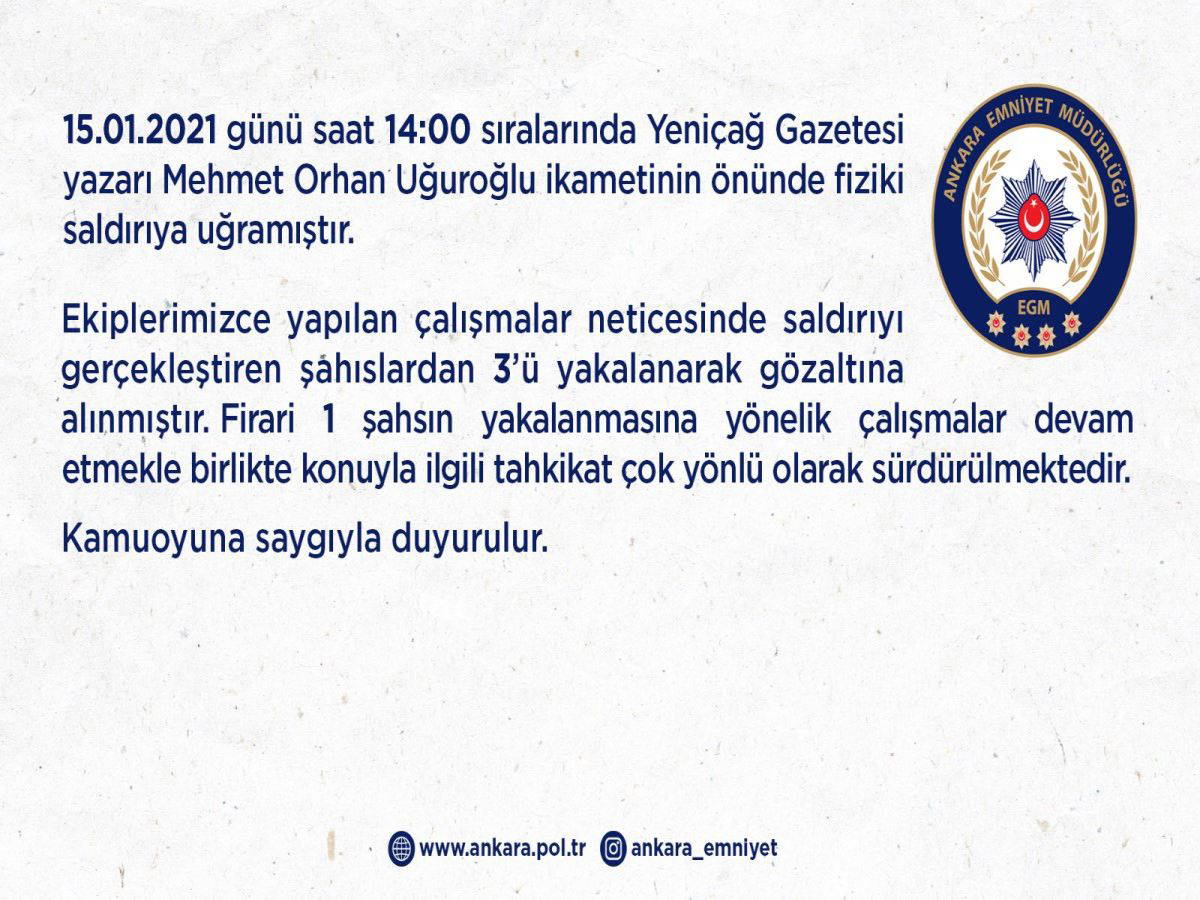 Saldırıların ardından Ankara Eminyet Müdürlüğü'nden, "Saldırıyı gerçekleştiren şahıslardan 3'ü yakalanarak gözaltına alınmıştır. Firari 1 şahsın yakalanmasına yönelik çalışmalar sürüyor" denildi.