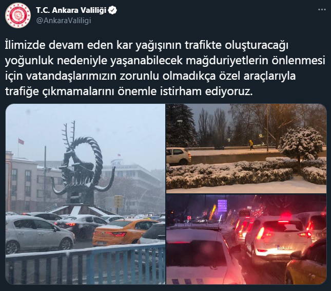Valilikten yapılan yazılı açıklamada, "İlimizde devam eden kar yağışının trafikte oluşturacağı yoğunluk nedeniyle yaşanabilecek mağduriyetlerin önlenmesi için vatandaşlarımızın zorunlu olmadıkça özel araçlarıyla trafiğe çıkmamalarını önemle istirham ediyoruz" denildi.