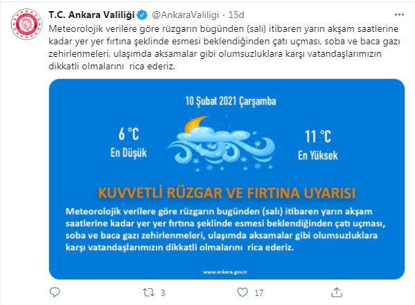 Valiliğin Twitter hesabından yapılan açıklamada, "Meteorolojik verilere göre rüzgarın bugünden (salı) itibaren yarın akşam saatlerine kadar yer yer fırtına şeklinde esmesi beklendiğinden çatı uçması, soba ve baca gazı zehirlenmeleri, ulaşımda aksamalar gibi olumsuzluklara karşı vatandaşlarımızın dikkatli olmalarını rica ederiz" denildi.