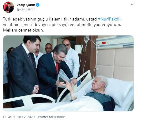 Vali Şahin, Twitter hesabı aracılığıyla paylaştığı mesajında "Türk edebiyatının güçlü kalemi, fikir adamı, üstad #NuriPakdil’i vefatının sene-i devriyesinde saygı ve rahmetle yad ediyorum. Mekanı cennet olsun." ifadelerini kullandı.