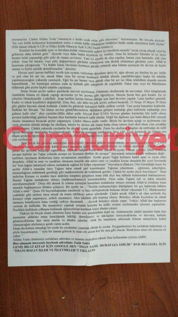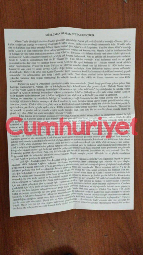 IŞİD'ın görüşlerinin savunulduğu ve şeriat propagandasının yapıldığı bildiride, Atatürk ilke ve inkılapları, demokrasi ve hatta oy kullanma hakkı bile hedef alınarak, "Türkiye de yaşayan insanlar olarak çok iyi biliyoruz ki 1920'lerden sonra hakimiyet yani emir ve yasak koyma Allah'a değil millete verilmiştir. Hatta Hakimiyet kayıtsız şartsız milletindir denmektedir. Türkiye de şeriat yani Kuran Kanunları değil (insanların kendi kafalarından çıkardıkları kanunlar) geçerli. Demokrasi de, laiklik de İslama tamamen ters olan küftir sistemleridir" denildi.