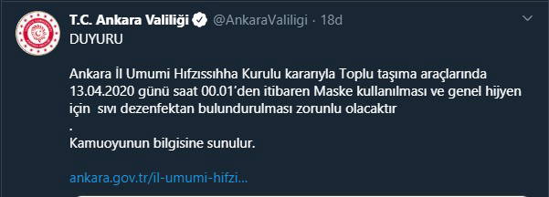 * 8. Toplu taşıma araçlarında sosyal mesafenin korunması amacıyla 13.04.2020 Pazartesi günü saat 00.01'den itibaren ilimiz dahilinde faaliyet gösteren toplu taşıma araçları (Otobüs, Özel Halk Otobüsleri, Minibüsler, Ankaray, Başkentray, Metro vb. ) ile şehirler arası ve ilçeler arası yolcu taşıyan ulaşım araçları, taksiler, her türlü ticari araç, servis araçları ve içerisinde birden fazla kişi bulunan özel araçlarda geçerli olmak üzere;