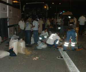 Çorum'dan İstanbul'a gitmekte olan sürücüsünün kimliği henüz belirlenemeyen 19 DU 644 plakalı yolcu otobüsü, kuzey çevre yolu Karapürçek mevkisinde arıza yaptı. Sürücünün yol kenarına çektiği otobüsteki yolcular için başka bir otobüs çağrıldı. Otobüsteki eşyalarıyla gelen otobüse aktarma yapan yolculara, sürücüsünün kimliği ve plakası henüz belirlenemeyen TIR çarptı.