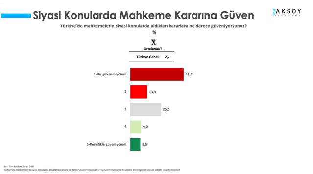Araştırmaya katılanların %57,6’sı mahkemelerin siyasi konularla ilgili aldıkları kararlara hiç güvenmediğini/güvenmediğini belirtti. Katılımcıların %17,3’ü mahkemelerin siyasi konularda aldıkları kararlara «Kesinlikle güveniyorum/Güveniyorum» yorumunda bulundu.