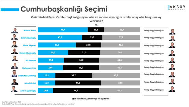 Türkiye Monitörü Aralık Sayısında katılımcıların olası bir Cumhurbaşkanlığı seçiminde tercihleri ikili kombinasyon olarak soruldu. Olası bir seçimde Cumhurbaşkanı Erdoğan’a karşı en yüksek oy oranına ulaşan siyasetçi %48,7 ile Ankara Büyükşehir Belediye Başkanı Mansur Yavaş oldu.