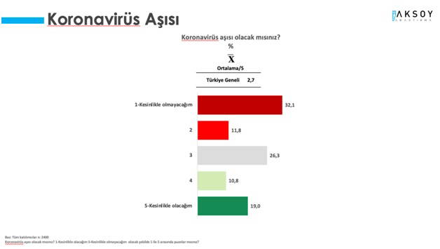 Gündemdeki gelişmelere paralel olarak katılımcılara koronavirüs aşıyla ilgili düşünceleri soruldu. Katılımcıların %43,9’u aşı olmayı kesinlikle düşünmediğini/düşünmediğini belirtti. "Kesinlikle düşünüyorum/Düşünüyorum" ifadesini kullananların oranı ise %29,8 olarak gerçekleşti.
