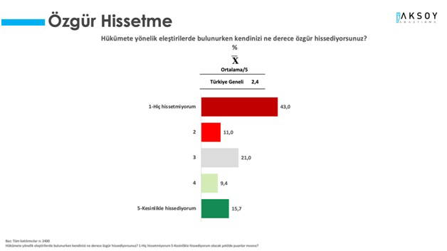 Araştırmaya katılanlara hükümete yönelik eleştiride bulunurken kendilerini ne derece güvende hissettikleri soruldu. Katılımcıların yalnızca %25,1’i kendisini kesinlikle özgür hissettiğini ifade etti.