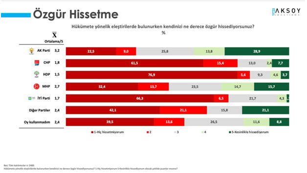 Benzer bir durumla AKP ve MHP seçmenlerinin verdikleri cevaplarda da karşılaşıldı. AKP seçmeninin %31,5’i "Kesinlikle özgür hissetmiyorum/Özgür hissetmiyorum" ifadesine katıldı. MHP seçmeninin ise %46,1’i hükümete yönelik yorumda bulunurken kendisini hiç özgür hissetmediğini/özgür hissetmediğini belirtti.