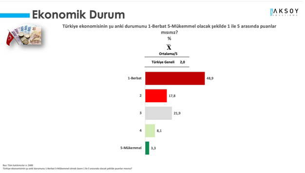 Araştırmaya katılanların %66,7’si Türkiye ekonomisinin mevcut durumunu "Berbat/Çok kötü" olarak değerlendirdi. Kasım ayı araştırmasında bu oran %65,7 olarak gerçekleşti. Türkiye ekonomisinin mevcut durumunu «Mükemmel/Çok iyi» olarak yorumlayanların oranı ise %11,4 olarak gerçekleşti. Aralık ayında döviz kuru baskının geçen aya oranla azalması ekonomiye olan değerlendirmenin olumlu olacağı yönünde beklenti yaratsa da vatandaşın artan fiyatlara karşı tepkisi bu ay da etkisini sürdürdü.