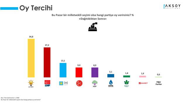 Parti bazında en yüksek oy oranına %34,8 ile AKP ulaştı. Birinci parti olarak çıkmasına karşın, son aylarda AKP’nin yaşadığı oy kaybı ise Aralık ayında da devam etti. Cumhur İttifakı’nın diğer ortağı MHP’nin oy oranı ise bu araştırmada %9 olarak gerçekleşti. AKP’de oy kaybının yaşanmasının temel sebebi olarak 2018 Milletvekili seçimlerine kıyasla belirli bir AKP'li seçmen grubunun partiyi tercih etmemesi olarak görüldü.