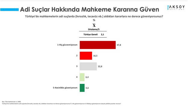Mahkemelerin adi suçlarla (hırsızlık, tecavüz vb.) ilgili aldıkları kararların da katılımcılar tarafından değerlendirilmesi istendi. Katılımcıların %64,3’ü alınan kararlara hiç güvenmediğini/güvenmediğini belirtti. Katılımcıların %13’ü alınan kararları "Kesinlikle güveniyorum/Güveniyorum" ifadesiyle değerlendirdi.
