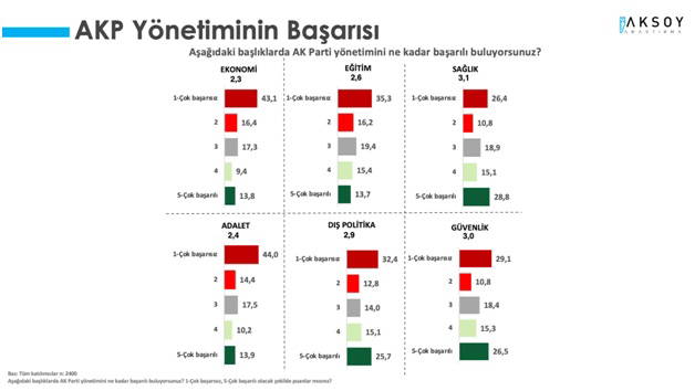 Aralık ayında AKP hükümetinin en başarısız bulunduğu alanlar, geçmiş araştırmalarda olduğu gibi ekonomi, eğitim ve adalet alanları oldu. Araştırmaya katılanların %59,5’i AKP yönetimini "Çok başarısız/Başarısız" olarak değerlendirdi. Adalet alanında ise katılımcıların %58,4’ü, eğitim alanında ise %51,5’i AKP yönetiminin çok başarısız/başarısız olduğunu ifade etti.