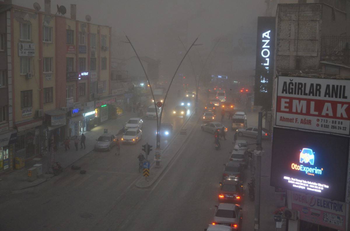İlçe merkezinde akşam saatlerinde oluşan toz bulutu, şehir içindeki görüş mesafesini kısıtlaması nedeniyle trafikte aksamalara yol açtı.