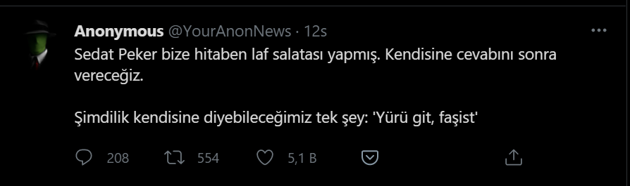 Anonymous, kendilerine yanıt veren Peker'e ilişkin Twitter hesabı üzerinden şunları yazdı:
