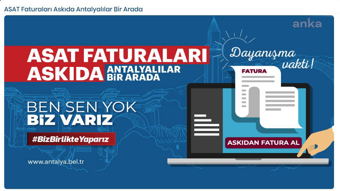 https://www.antalya.bel.tr/Covid-19/Askıya-Fatura-Bırak adresinden erişilebilen sisteme, ABB sosyal hizmet birimi tarafından onaylanmış ihtiyaç sahibi aileler, ödeme güçlüğü çektikleri faturalarını bırakıyor. Yine aynı adrese erişen herkes bu sisteme bırakılmış faturalardan istediklerini ödeyerek dayanışmaya katkı veriyor. Böylece veren elin alan eli görmediği bir dayanışma geliştiriliyor ve ihtiyaç sahibi aileler bir ölçüde rahatlatılmış oluyor.