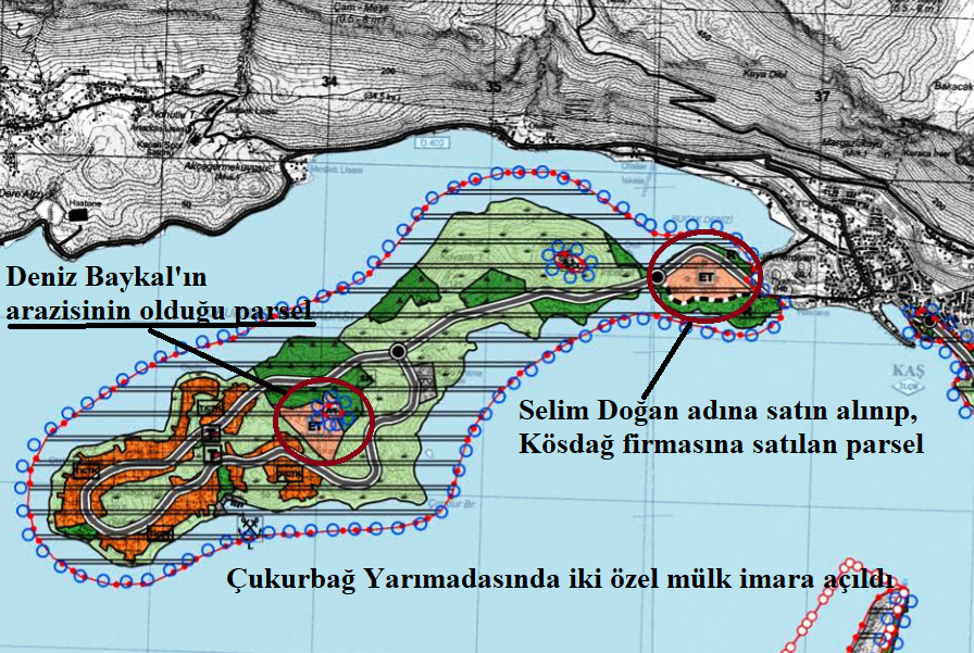 Çukurbağ Yarımadası’nda imara açılan iki büyük parselden biri de eski CHP lideri ve Antalya Milletvekili Deniz Baykal’ın hissedarı olduğu arazinin bulunduğu bölgede yer alıyor. Deniz Baykal’ın Kaş’taki arazisinin varlığı yıllardır yerel halk tarafından biliniyor. Ancak arazinin sit alanı ve zeytinlik vasfında olması imara açılmasına engel oluyordu. Baykal’ın, Kaş’taki arazisiyle ilgili eski Çevre ve Şehircilik Bakanı Erdoğan Bayraktar ile telefon konuşması yaparak ‘ricacı’ olduğu da ortaya çıkmıştı. Eski Bakan Bayraktar’ın, Çevre ve Şehircilik Bakanlığı Mekânsal Planlama Genel Müdürü Mehmet Ali Kahraman ile yaptığı iddia edilen bir telefon konuşması yasal dinlemelere takılmış, bu konuşmanın deşifreleri ise 4 bakan hakkında hazırlanan 17-25 Aralık fezlekelerinin eklerinde yer almıştı.