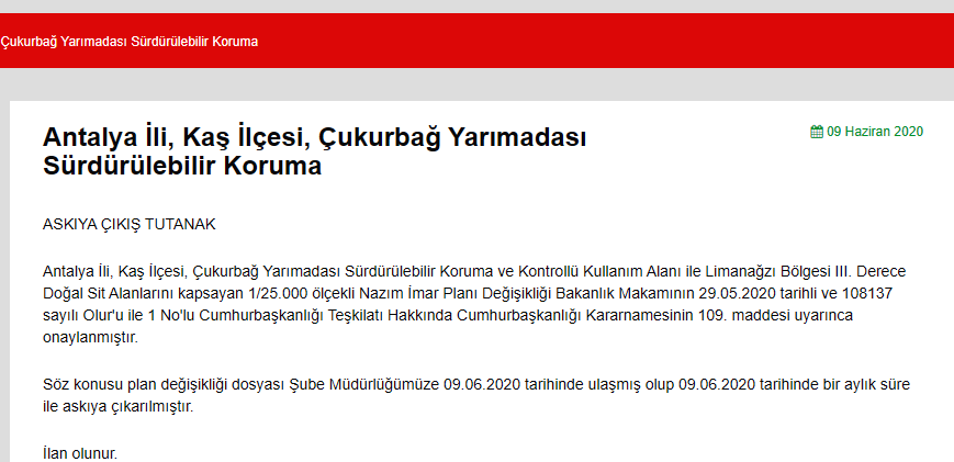 OdaTV'den Yusuf Yavuz'un haberine göre, Antalya’nın Kaş ilçesinde bulunan doğal sit alanlarını kapsayan 1/25 binlik Nazım İmar Planı Çevre ve Şehircilik Bakanlığı’nca onaylandı. Geçtiğimiz ay çıkan yangınla gündeme gelen Çukurbağ Yarımadası ile karayolu ulaşımı bulunmayan Kaş’ın ünlü doğal plajlarını da barındıran Limanağzı bölgesini kapsayan plan, 9 Haziran’da Antalya Çevre ve Şehircilik İl Müdürlüğü’nde askıya çıkarıldı. Bir ay boyunca askıda kalacak olan yeni imar planında Çukurbağ Yarımadası’nın İnceboğaz ve İnönü mevkilerinde bulunan iki ayrı bölgenin ‘E-T-Eko- Turizm’ vasfıyla yapılaşmaya açılması dikkat çekiyor.