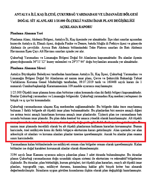Yeni hazırlanan 1/25 binlik Nazım İmar Planı’nın açıklama raporunda, daha önceki alt ölçekli planların kullanım kararlarını olduğu gibi korunacağı kaydedilerek, “Bunun haricinde, özel mülkiyete konu iki farklı bölgeye eko-turizm kararı getirilmiştir. Yarımadanın kalan bölümlerinde ise mülkiyeti orman olan bölgeler orman olarak işaretlenmiştir. Kalan bölümler ise doğal karakteri korunacak alanlar olarak düzenlenmiştir” ifadelerine yer veriliyor.