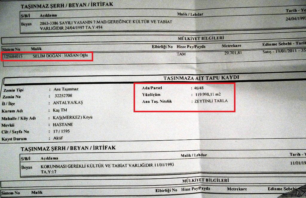 Dönemin Bakanı Faruk Çelik’in iptal edildiğini açıkladığı zeytinlik araziyi imara açma girişiminin doğru olmadığı ortaya çıktı. Kaş’ın betonlaşmadan korunmuş son doğal alanlarından biri olan ve Yunanistan’ın Meis adasına bakan deniz kıyısındaki arazinin tapu kayıtlarına bakıldığında geçmişte ‘zeytinli tarla’ olan vasfının ‘tarla’ olarak değiştirildiği ve tapuya bu şekliyle kaydedildi. İddiaya göre geçmişte Selim Doğan adına kayıtlı olan söz konusu parsel, İstanbul-Üskudar (Kısıklı) merkezli bir ambalaj firmasına devredildi. Firmanın adı, Kösdağ Ambalaj Ürünleri Ticaret A.Ş. Kurucusu ise Ahmet Hasan Kösdağ. Ülker Grubuyla da ticari ilişkileri olduğu bilinen Kösdağ’ın ambalaja yönelik başka yatırımları da bulunuyor.
