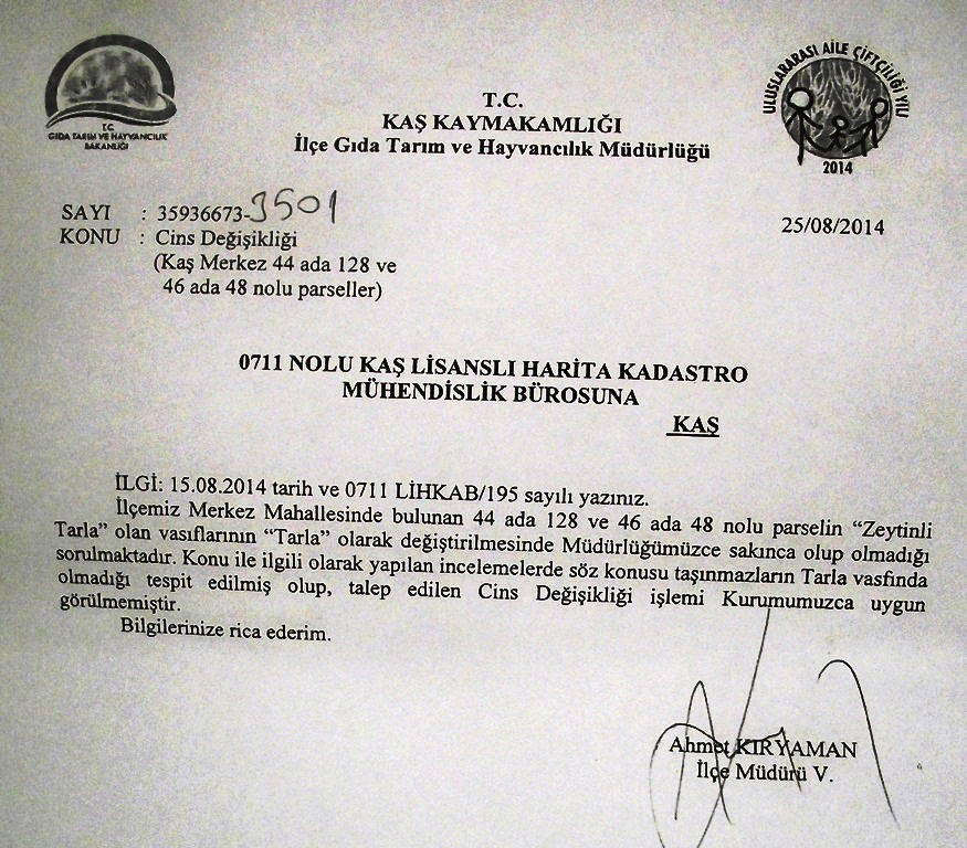 “Antalya Kaş İlçesi Merkez Mahallesi’nde bulunan 46 ada 48 nolu parselin cins değişikliği için Kaş İlçe Gıda Tarım ve Hayvancılık Müdürlüğümüzce yürütülen işlemlerle ilgili olarak Antalya İl Gıda Tarım ve Hayvancılık Müdürlüğümüzce soruşturma başlatılmıştır. Soruşturma sonucu ilgili personele disiplin işlemi uygulanmış, cins değişikliği işleminin iptali için Kadastro Bölge Müdürlüğüne müracaat edilerek tapunun beyanlar hanesine cins değişikliği uygun görüş yazısının iptal edildiğine yönelik şerh koydurulmuş ve arazinin yeniden zeytinli tarla vasfına dönüştürülmesi için ilgili mahkeme de dava açılmıştır.”