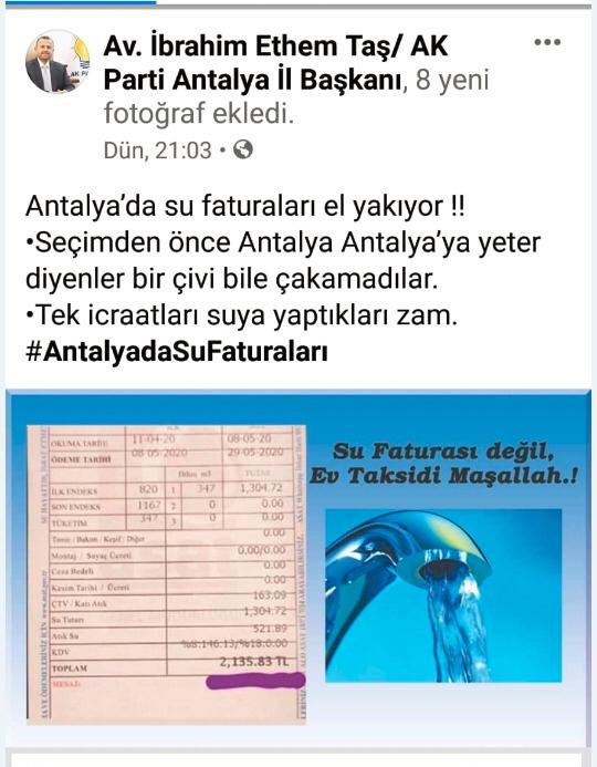 Antalya’da su faturaları üzerinden başlatılan partiler arası tartışma, sosyal medyaya da yansıdı. AKP Antalya İl Başkanı İbrahim Ethem Taş, CHP’li Büyükşehir Belediyesi’ni ‘su faturalarını 3’e katlamakla’ suçladı. ASAT’tan ve Büyükşehir Belediyesi’nden ‘zam yapılmadı’ açıklamaları geldi.