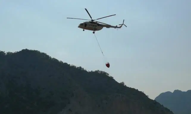 Çevredeki vatandaşların haber vermesi üzerine yangına, 2 helikopter, arazöz, orman işçileri ve itfaiye ekipleri müdahale ediyor.