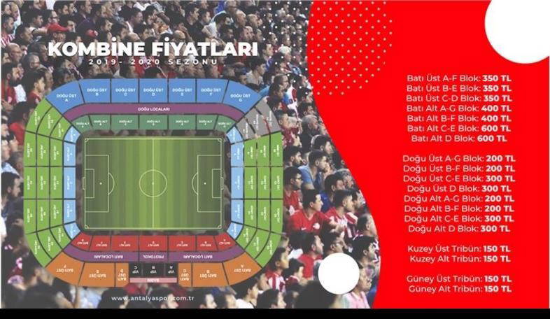 Antalyaspor’da kombine kart satışları öncelikle, batı alt, doğu alt, kale arkaları alt, kale arkaları birinci katlar için yapılacak. Satışa çıkan alt katların doluluk oranı yüzde 80'e ulaştığında, aynı tribünlerin üst katlarının satışına başlanacak. Kırmızı beyazlılar VIP tribün kombine fiyatları ve satış tarihlerini ise daha sonra duyuracak.