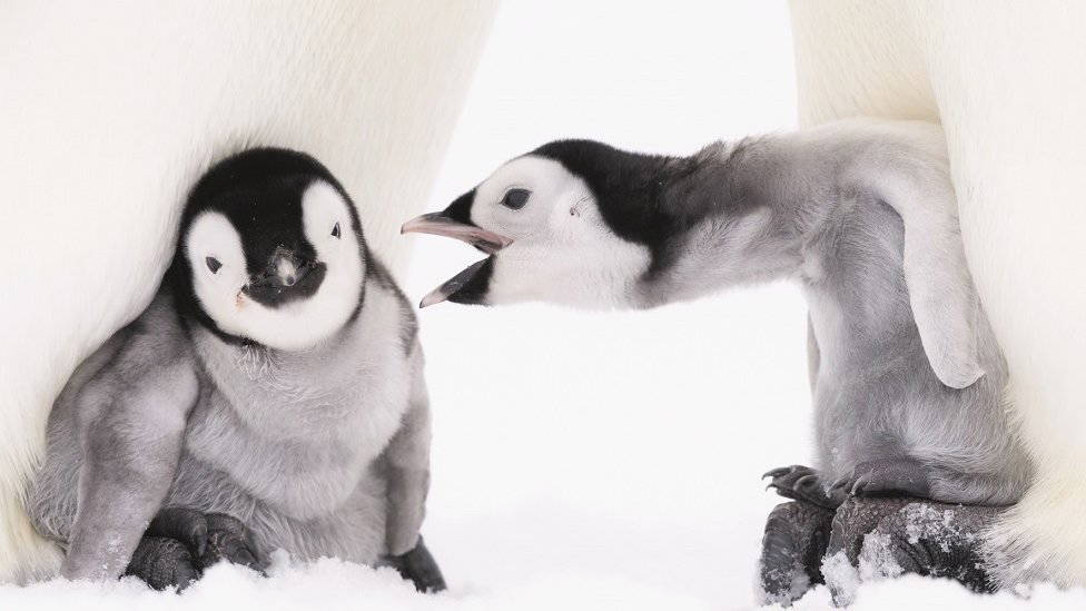 Burada penguenleri fotoğraflayan sanatçı, bu hayvanların toplanma eylemlerinin soğuğa karşı gizli bir silah ve nihai hayatta kalma stratejisi olduğunu söylüyor ve şöyle devam ediyor: