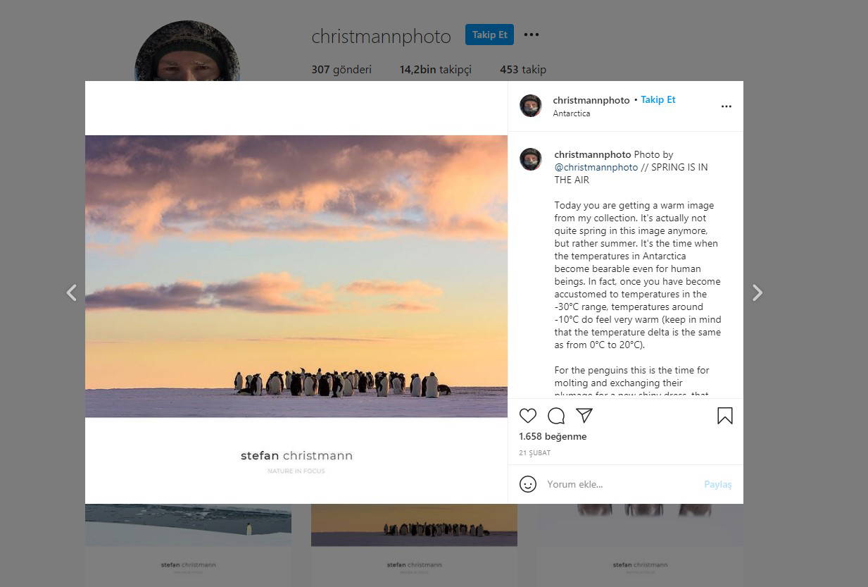 Sir David Attenborough'nun seslendirdiği BBC yapımı belgesel serisi 'Dynasties'te (Hanedanlar) kamera asistanı olarak görev yapan Christmann, 'Penguin: A Story of Survival (Penguen: Bir Hayatta Kalma Hikayesi) adlı yeni kitabında, Antartika'da çektiği bazı fotoğrafları meraklılarıyla paylaştı.