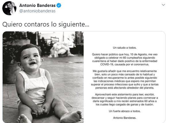 Banderas,yaptığı açıklamada, "Bugün, 10 Ağustos, koronavirüsten kaynaklanan Kovid-19 hastalığının testinin pozitif çıkmasının ardından 60. doğum günümü karantinadan sonra kutlamak zorunda olduğumu kamuoyuna duyurmak istiyorum” ifadelerini kullandı.