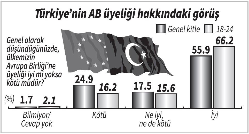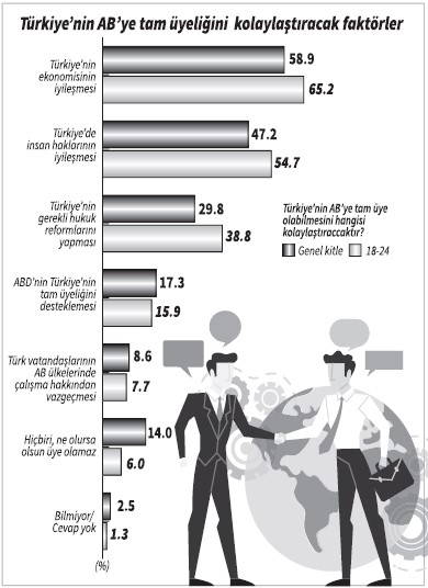 Tabii ki, AB’ye katılımı destekleyenlerin hepsi aynı motivasyonla hareket etmiyor. Ekonomik refah motivasyonuyla isteyenler de var, demokrasi ve insan haklarına getireceği veya getirebileceği iyileşmeyi düşünerek destekleyenler de... Türkiye’de AB’ye katılımı farklı toplum kesimlerinin farklı motivasyonlarla desteklemesi gayet normal tabii. Fakat burada dikkati çeken, gençlerde hak ve hukuka getireceği iyileşme dolayısıyla bu süreci desteklemenin daha yüksek oluşu.
