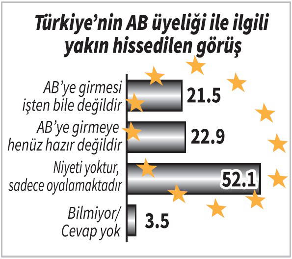 - Türkiye’de şöyle bir rüzgâr var: “Avrupa Birliği biz ne yaparsak yapalım, bizi almayacak... AB ikiyüzlü davranıyor...” Aslında araştırmanızda da yüzde 53’le “Türkiye’yi kabul etme niyeti yoktur, sadece oyalamaktadır” görüşü hâkim. Doğru bir bakış açısı mı?