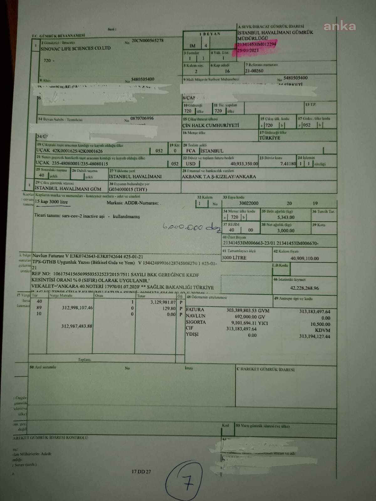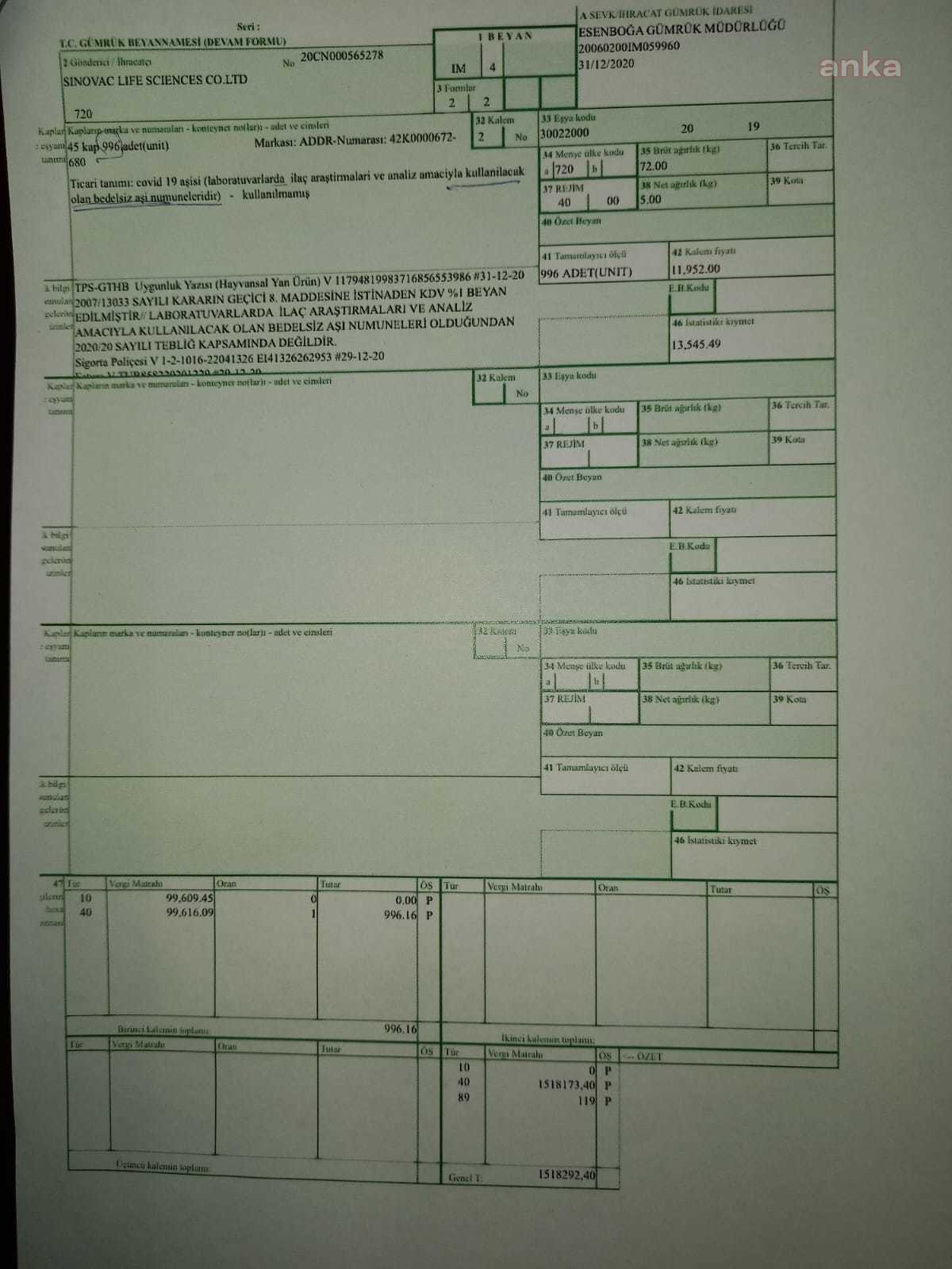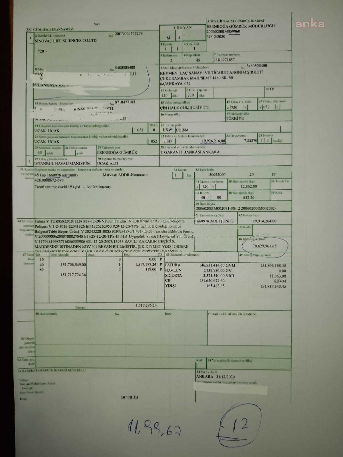 Keymen’in aracı firma olup olmadığı tartışmalarına bir yenisi daha eklendi. İstanbul Havalimanı Gümrük Müdürlüğü ile Ankara Esenboğa Havalimanı Gümrük Müdürlüğü’nün farklı tarihlerdeki beyannamelerinde, Çin’den gönderilen aşıların birim fiyatları farklılık gösterdi. Flakonlu yani dozu hazır halde getirilen aşıların 12 dolar, likit halde getirilen aşıların fiyatının 7 dolar olduğu ortaya çıktı. Keymen İlaç’ın ismi de beyannamelerde “serbest muhasebeci/mali müşavir” kısmına yazıldı.