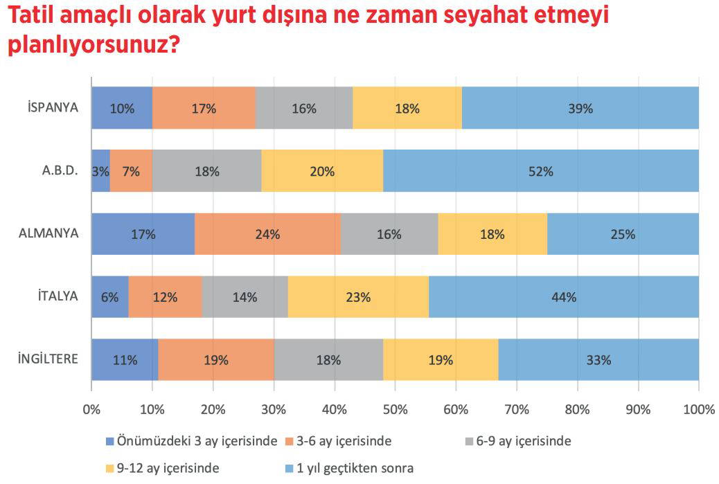 'Tatil amaçlı olarak yurt dışına ne zaman seyahat etmeyi planlıyorsunuz?' şeklindeki soruya verilen yanıtlar, yurt dışı tatile en istekli grubun Alman vatandaşları olduğunu ortaya koymaktadır.