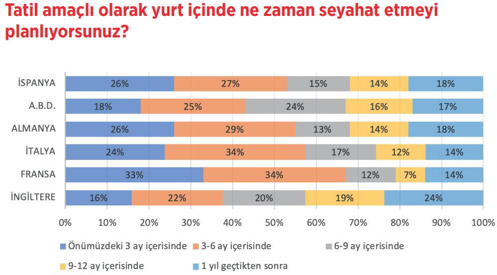 'Tatil amaçlı olarak yurt içinde ne zaman seyahate çıkmayı planlıyorsunuz?' sorusuna verilen yanıtlar, önümüzdeki 6 aylık süreçte yurt içi tatile en istekli olanların Fransızlar olduğunu ortaya koyarken Fransızları İtalyanlar ve Almanlar izledi. Tatile en az istekli olanlar ise İngilizler oldu.