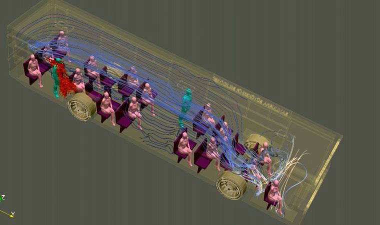 Simülasyonda toplu taşıma aracında 2 kişinin öksürmesi veya hapşırması durumunda virüs partiküllerinin dağılımı tespit edildi.