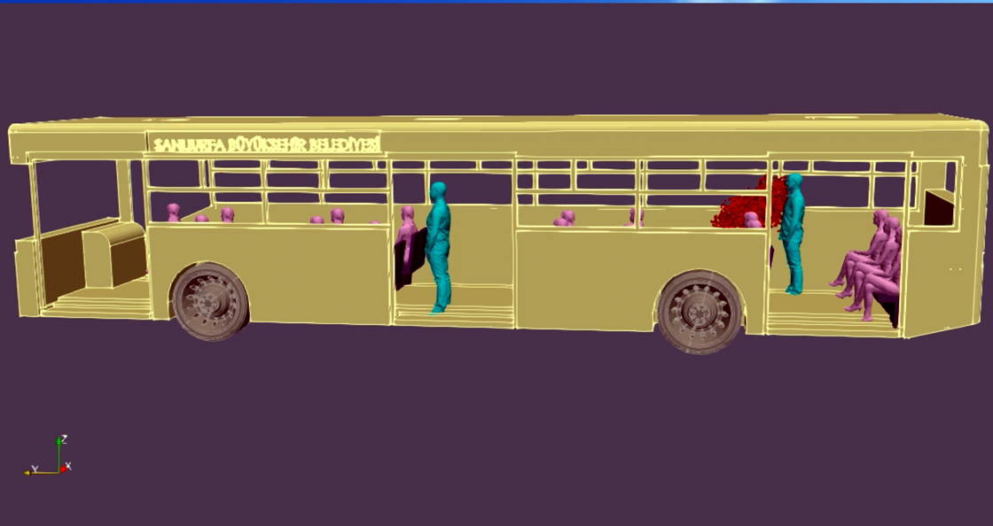 Harran Üniversitesi Yüksek Başarımlı Hesaplama Merkezi'nde 24 bilgisayarın bir araya getirilmesiyle oluşturulan "süper bilgisayar", ön kapısı ve arkadaki üst 2 penceresi açık bir toplu taşıma aracını referans alarak simülasyon hazırladı.