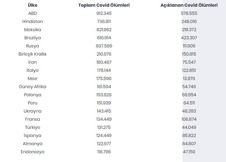 IHME Raporu’na göre ülkelerdeki olası vefat sayıları ve açıklanan vefat sayılarının sıralaması şöyle: