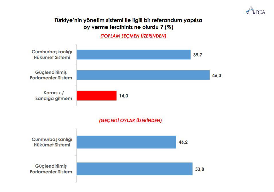 Türkiye’nin yönetim sistemi nasıl olmalı sorusuna (kararsızlar dağıtıldığında); “Güçlendirilmiş Parlamenter Sistem” diyenler yüzde 53.8 iken “Cumhurbaşkanlığı Hükümet Sistemi” diyenler yüzde 46.2’de kaldı.
