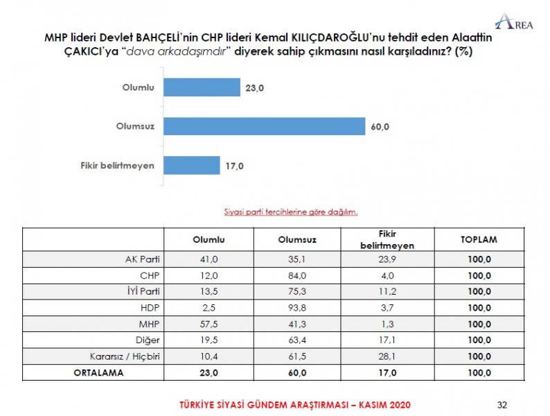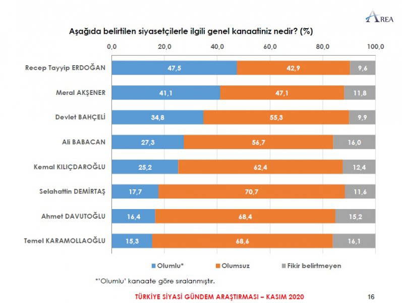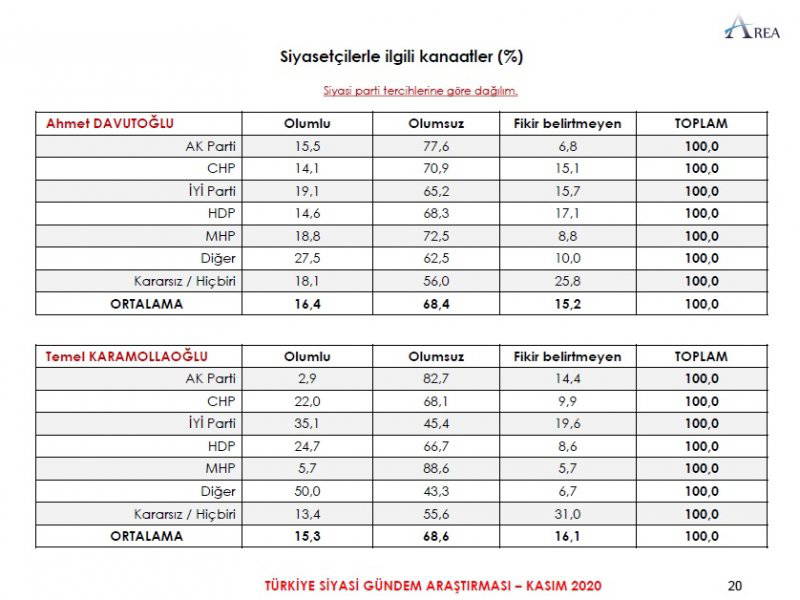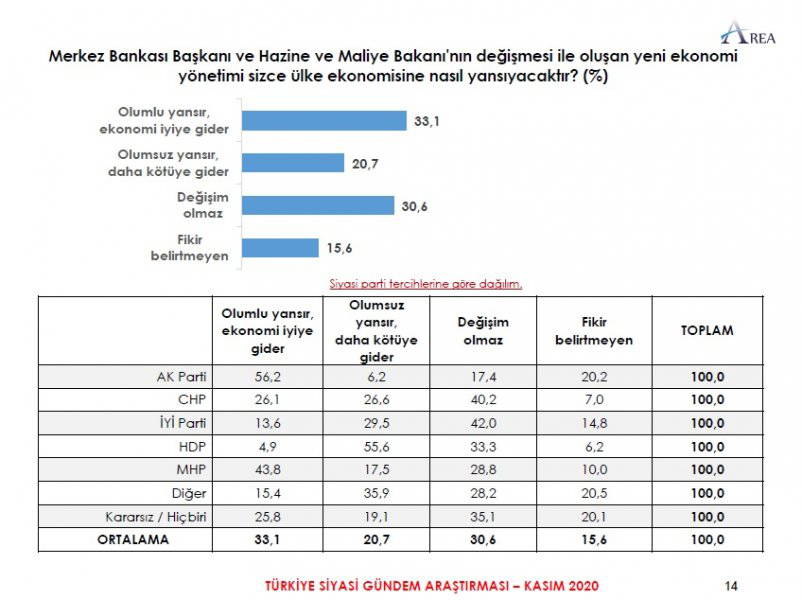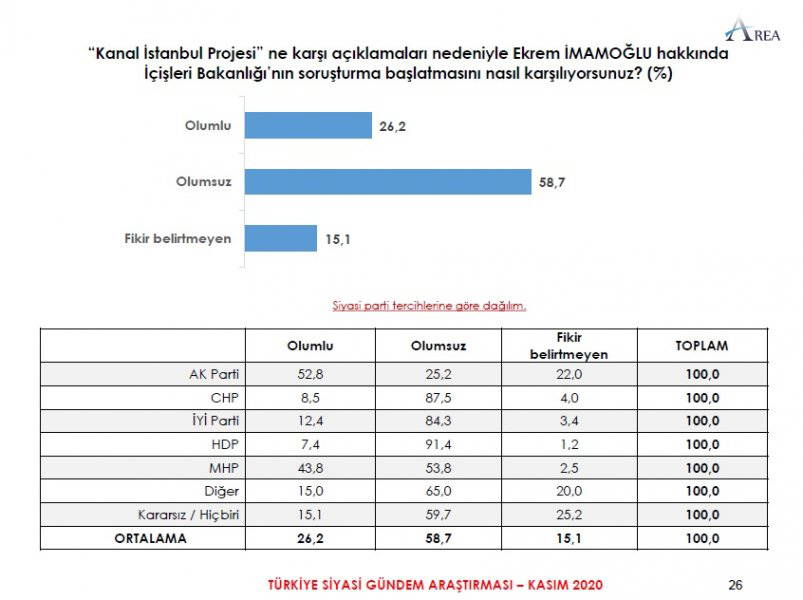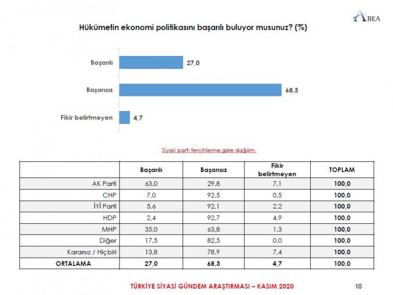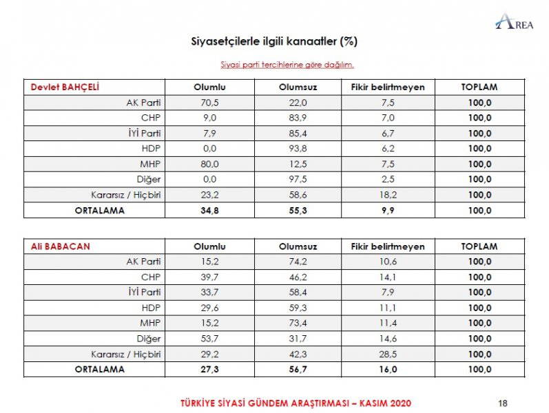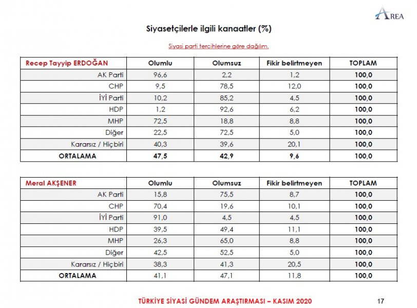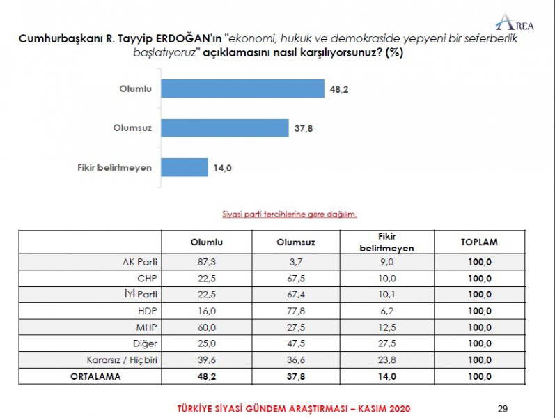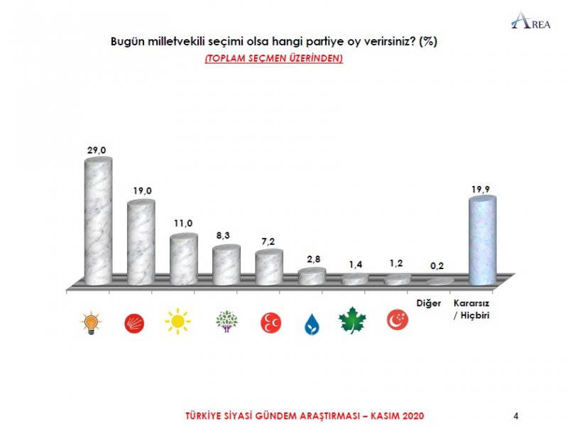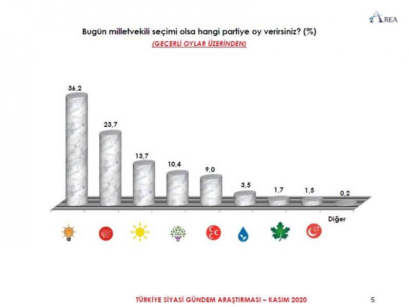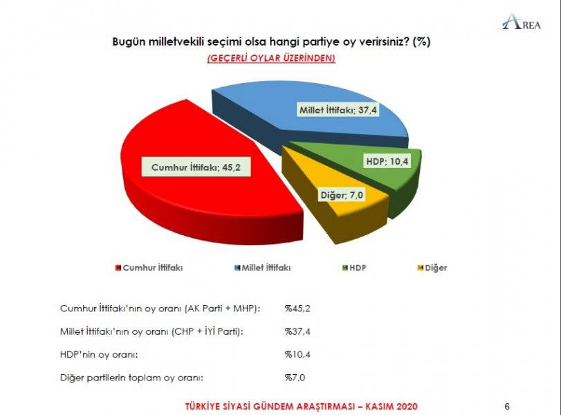 Area Araştırma'nın anketine göre AKP ve MHP'nin oluşturduğu Cumhur İttifakı'na destek oranı 45.2'ye düştü. Partilerin son oy oranları ise şöyle: