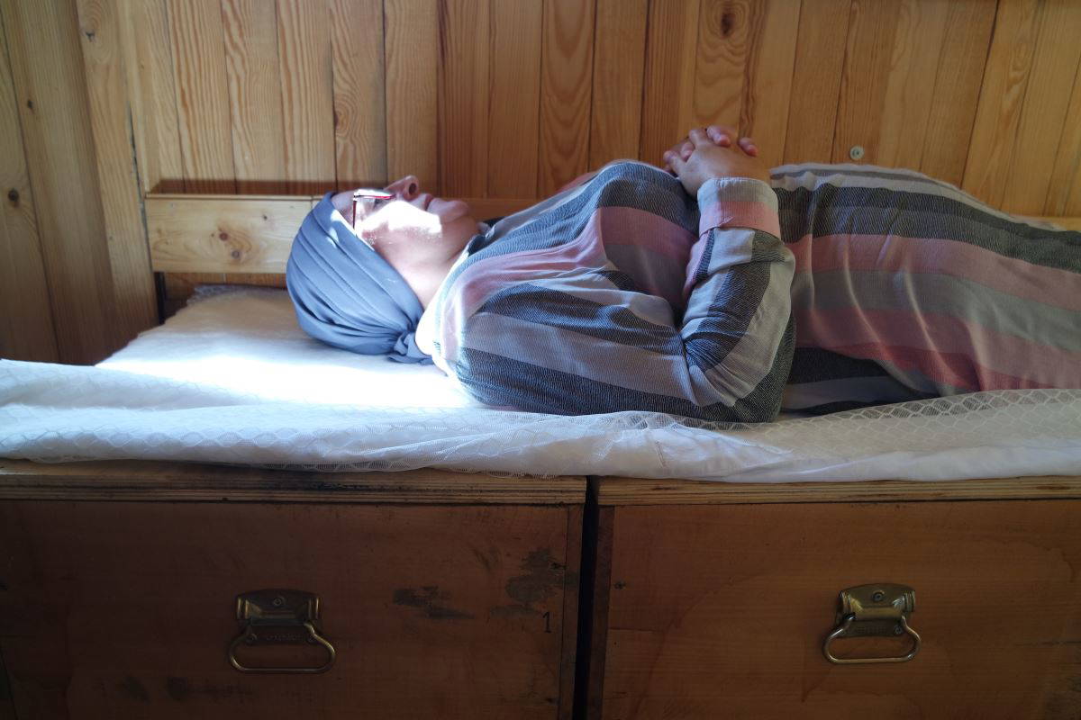 Ünal, çalışmalar kapsamında bir kabin içinde bulunan 4 kovan üzerine yerleştirilmiş arı yatağı oluşturdu. Arı sesi dışında giriş olmaması için özel izolasyon kullanılan ahşap kabindeki yatağa uzananlar, arıların kanat seslerini dinliyor.