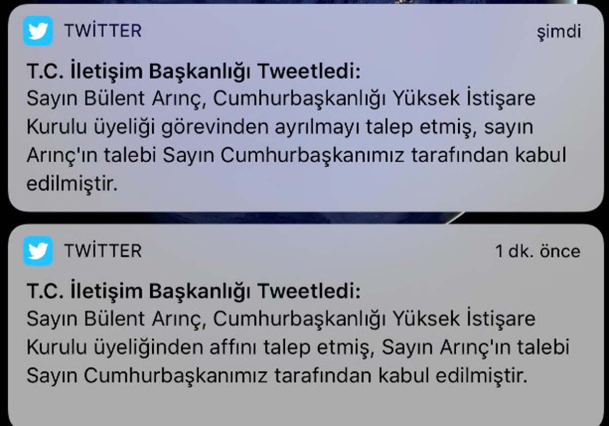 Eski Hazine ve Maliye Bakanı Berat Albayrak'ın istifasını 'af talebi' olarak açıklayan İletişim Başkanlığı, Bülent Arınç'ın istifasında önce aynı kelimeyi kullandı, ardından 'istifa talebi' olarak açıklamayı revize etti.