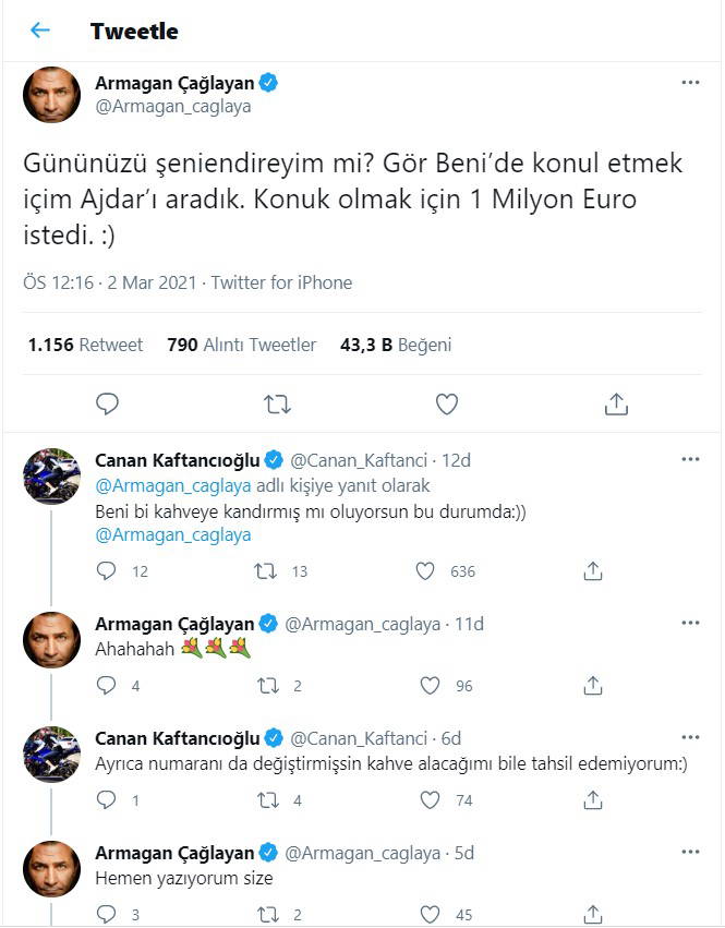 CHP İl Başkanı Canan Kaftancıoğlu, Çağlayan'ın paylaşımına "Beni bir kahveye kandırmış mı oluyorsun bu durumda. Ayrıca numaranı da değiştirmişsin kahve alacağımı bile tahsil edemiyorum:)" yanıtını vererek sosyal medyada gündem olan "Ajdar 1 milyon Avro istedi" açıklamasına dahil oldu.