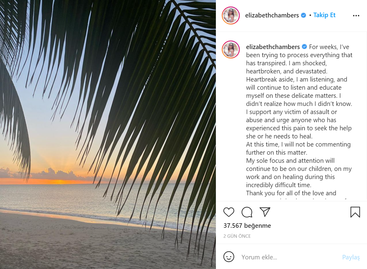 Bilmediklerimin farkında değildim. Herhangi bir saldırı veya taciz mağdurunu destekliyorum ve bu acıyı yaşayan herkesi iyileşmesi için ihtiyaç duyduğu yardımı aramaya çağırıyorum. Şu anda konuya dair daha fazla yorum yapmayacağım. Bu inanılmaz zor zamanda odağımda çocuklarım, işim ve iyileşme olmaya devam edecek.