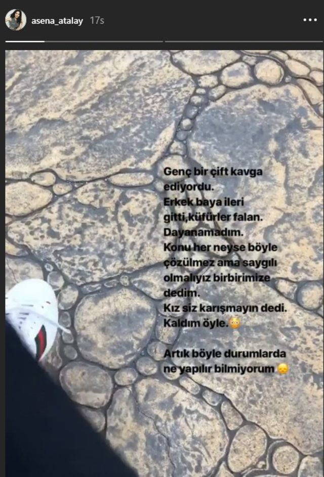 Sokakta genç bir çiftin kavgasına tanıklık eden Atalay son dönemlerde bir hayli artan kadına şiddet olaylarından dolayı hassasiyeti yüksek olduğu için ikiliyi uyarma gereği duydu ancak karşılığında hiç beklemediği bir tepkiyle karşılaştı…İşte Asena Atalay’ın konuyla ilgili o paylaşımı: